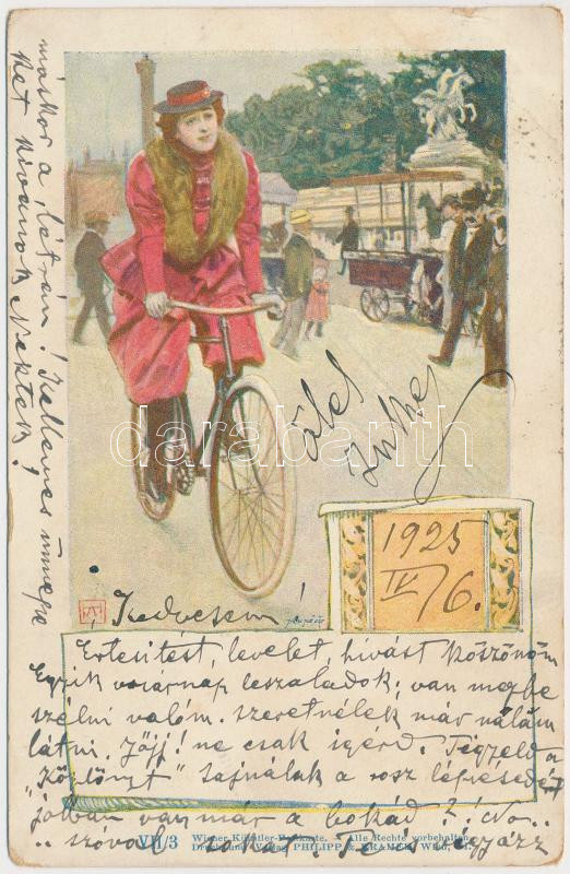 Leírás: Lady on bicycle, Philipp & Kramer VII/3. So. Stpl (small tear)