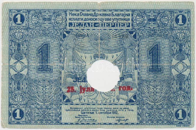 Montenegro 1912. 1 Perper with "25.07.1914" overprint, cancelled with a hole C:F
