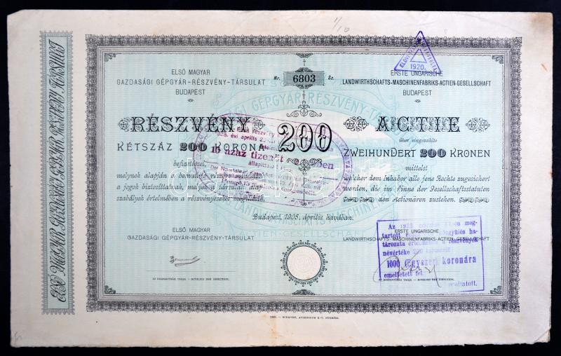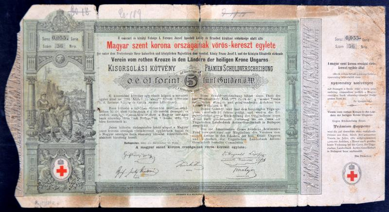 Budapest 1882. "Magyar szent korona országainak vörös-kereszt egylete" Kisorsolási kötvény 5Ft-ról + Budapest 1905. "Első Magyar Gazdasági Gépgyár-Részvény-Társulat" részvénye 200K-ról, szárazpecséttel, szelvényekkel, felülbélyegzésekkel T:IV,II-
