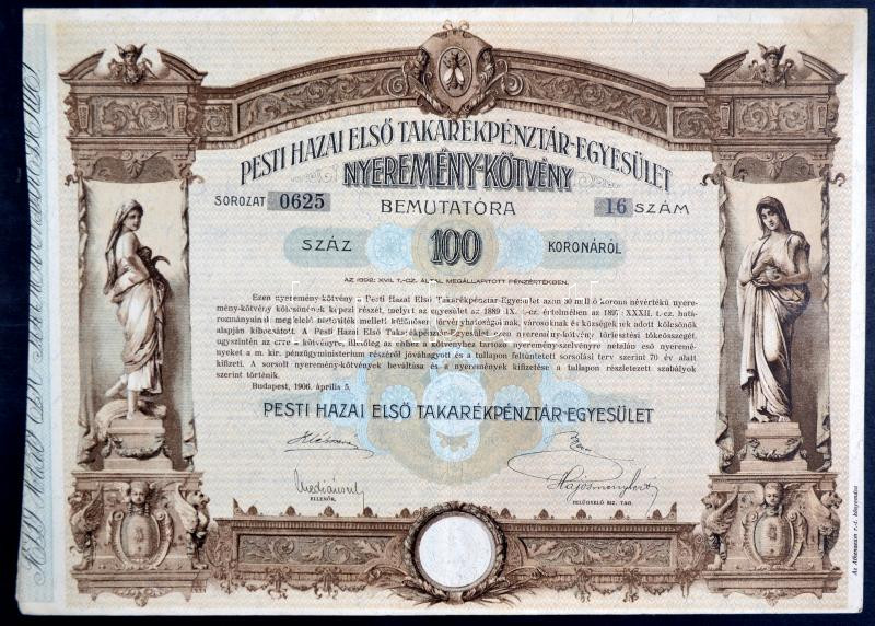 Leírás: Budapest 1906. "Pesti Hazai Első Takarékpénztár-Egyesület" nyeremény-kötvénye 100K-ról, szárazpecséttel T:II-