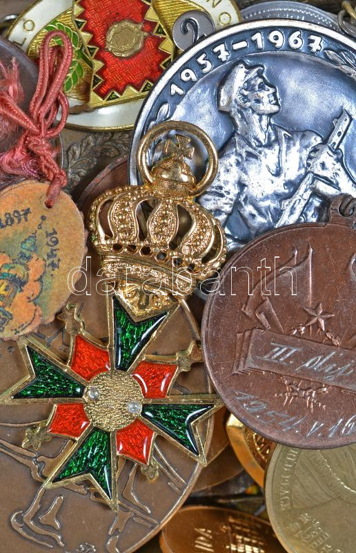 Leírás: Kis doboznyi vegyes magyar és külföldi emlékérem, jelvény, sportérem, régi és modern darabok is T:vegyes