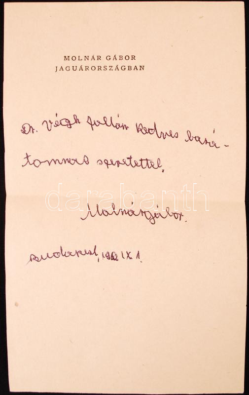 Molnár Gábor: Négyen a vadonban c. könyvének dedikált belső címlapja https://www.darabanth.com/hu/214-Gyorsarveres/214.0/Festmeny-mutargy-papirregiseg-egyeb/Alairas~20/Molnar-Gabor-Negyen-a-vadonban-c-konyvenek-dedikalt-belso-cimlapja~II894237