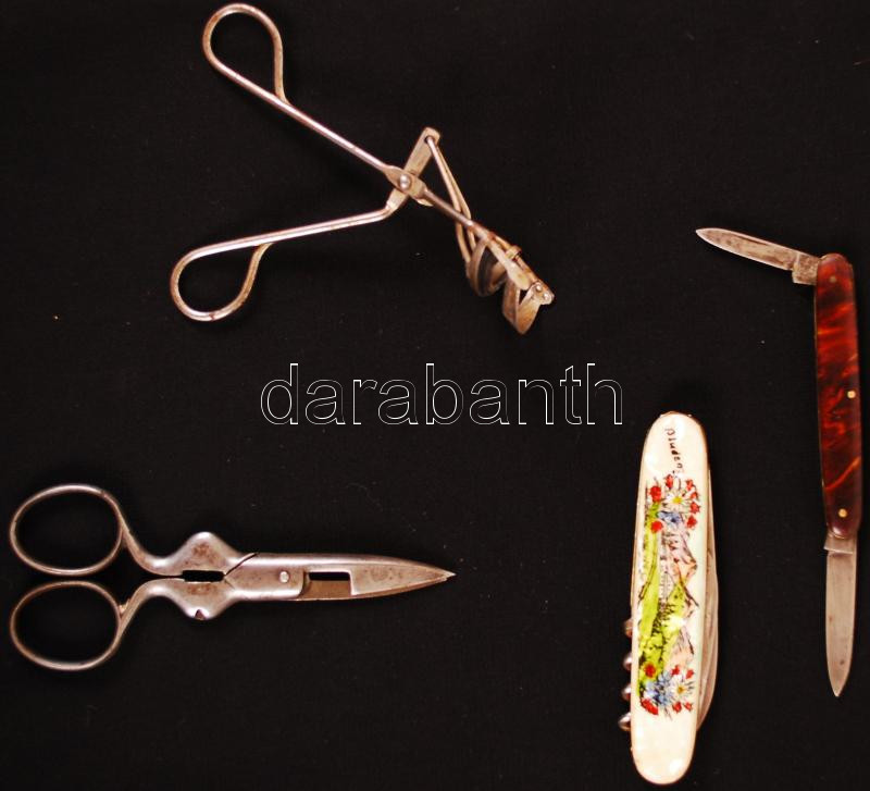 Leírás: 1 db régi olló, 1 db szempilla-göndörítő, 2 db bicska