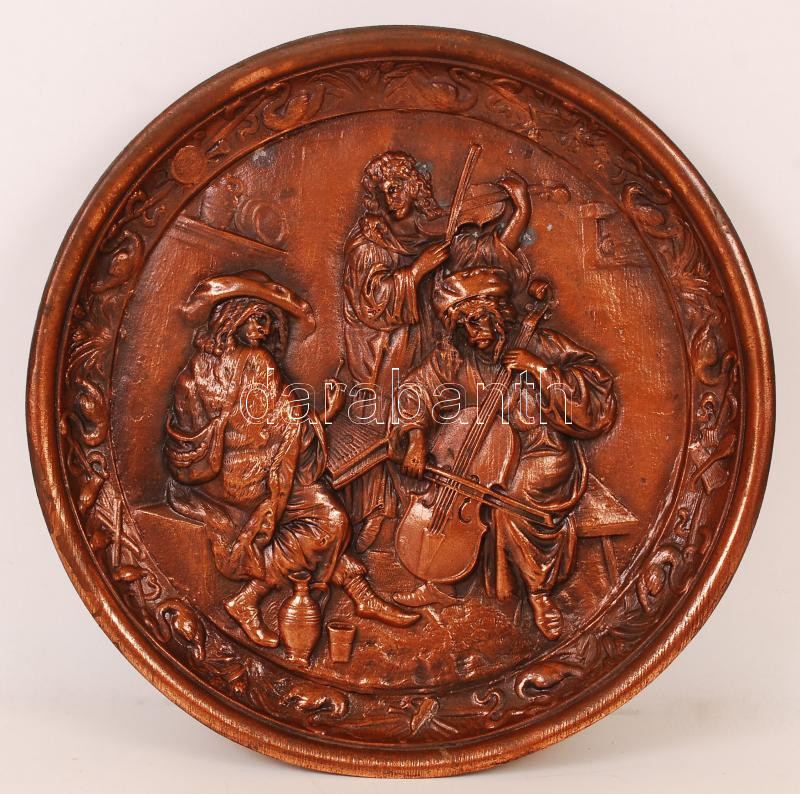 Leírás: Mulatozó zenészek dísztál, bronzírózott fém, d:34 cm