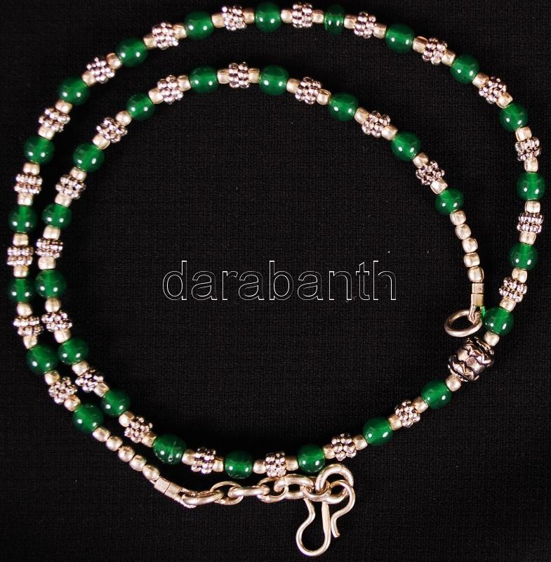 Leírás: Zöld és ezüst színű gyöngyökből fűzött dekoratív nyaklánc , h: 40 cm /