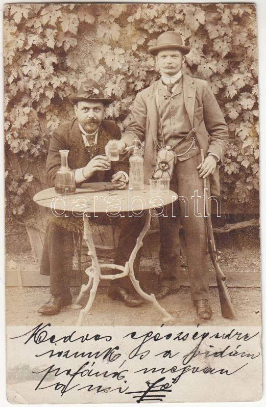 Leírás: 1904 Kassáról Kassára küldött privát fotólap, rajta két vadász, 14x9 cm
