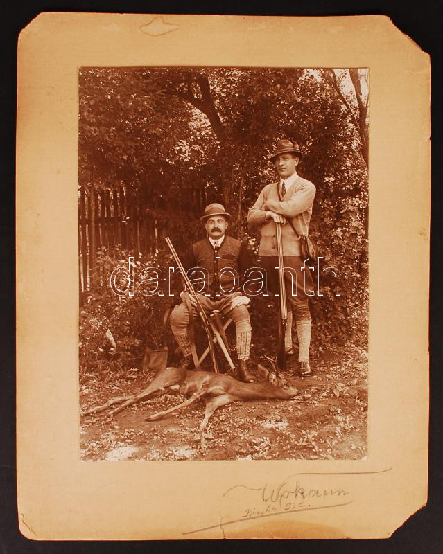 Leírás: 1926 Wokaun (Bicske): Bicskei vadászok a napi zsákmánnyal, képméret 24x17 cm, karton (hiányos és sérült) 31x25 cm