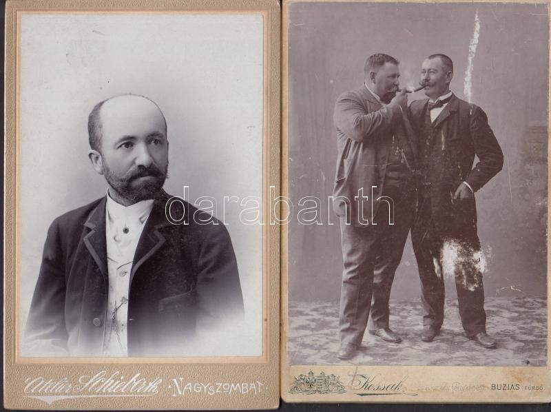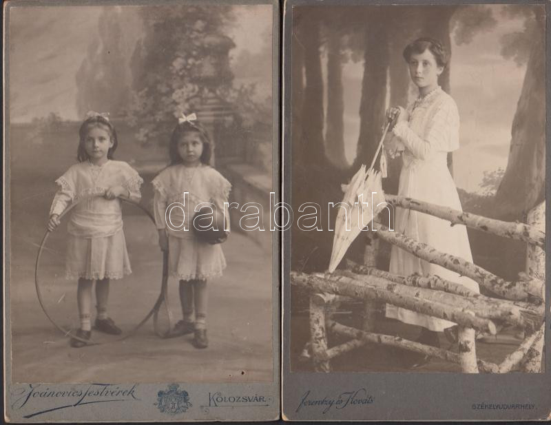 cca 1900-1930 Erdélyi fotótörténeti leletek, Székelyudvarhely, Kolozsvár, Nagyszombat, Nagyszeben, Boksánbánya, Buziásfürdő fotóműtermeiben készült kabinetfotók, 6 db keményhátú fénykép, 16x10 cm