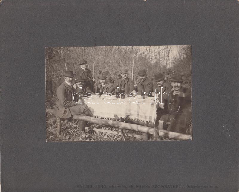Leírás: cca 1900 Knebel Jenő (Szombathely): Erdészek és vadászok asszonymentes erdei piknikje, fotóméret 10x16 cm, karton 22x27 cm