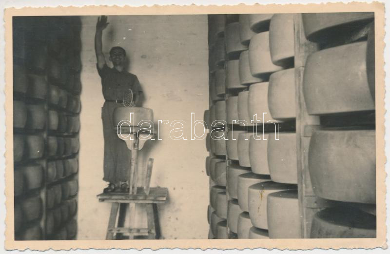 cca 1930 Sajtmester az érlelő sajtraktárban, cakkos szélű fotólap, 9x1... https://www.darabanth.com/hu/214-Gyorsarveres/214.0/Festmeny-mutargy-papirregiseg-egyeb/Foto~21/cca-1930-Sajtmester-az-erlelo-sajtraktarban-cakkos-szelu-fotolap-9x14-cm~II893157