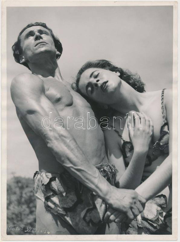 cca 1930 SzöllÅ‘sy Kálmán (1887-1976): Kiűzetés a Paradicsomból, Pásztor János és Zsolnai Judit, pecséttel jelzett, feliratozott vintage fotó Szentpál Olga tánccsoportjának archÃvumából, 24x18 cm