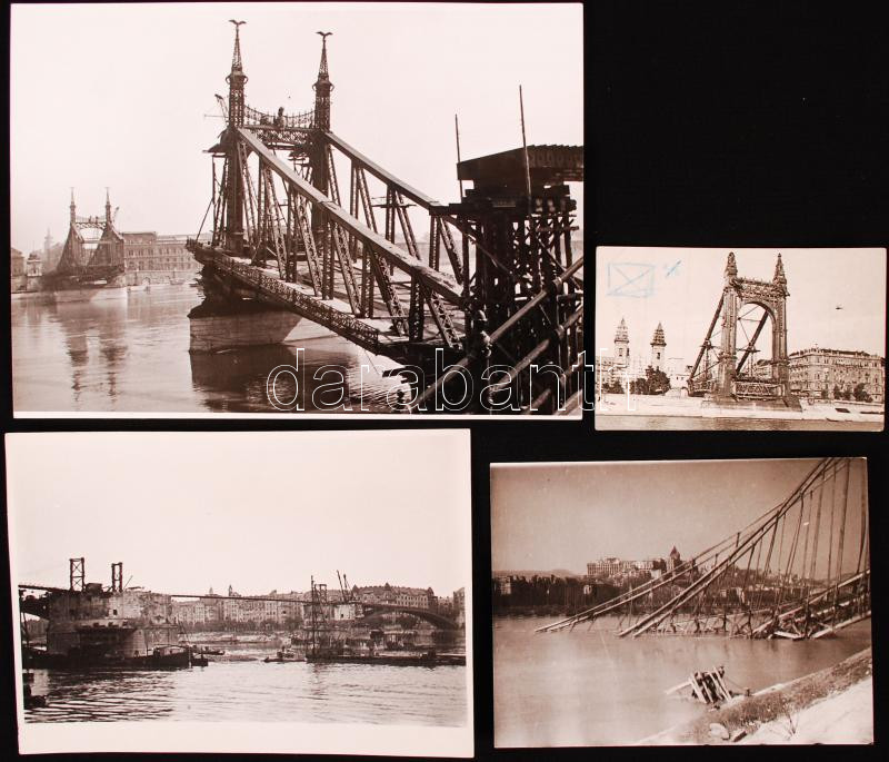 Leírás: cca 1945-1948 Budapest lerombolt hídjai, 4 db fotó, 2 közülük Tiszavölgyi József pecsétjével, 9x6 és 18x13 cm közötti méretekben
