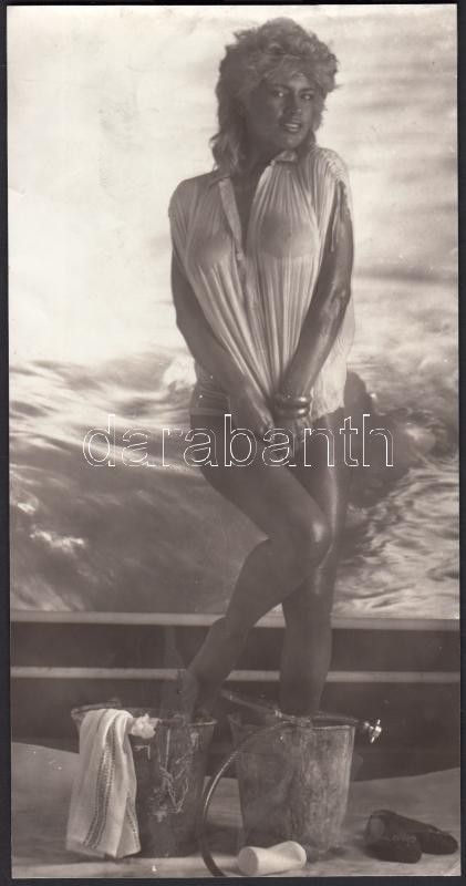 Leírás: cca 1970-1980 Tengerparti illúzió magyar reklámfotó műterem vetített háttere előtt, finoman erotikus vizes blúzban, 23x12 cm
