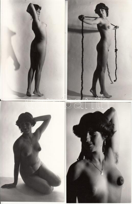 Leírás: cca 1970-1980 Vali első fotózása, 4 db levlap méretű, finoman erotikus fénykép, 14x9 cm /