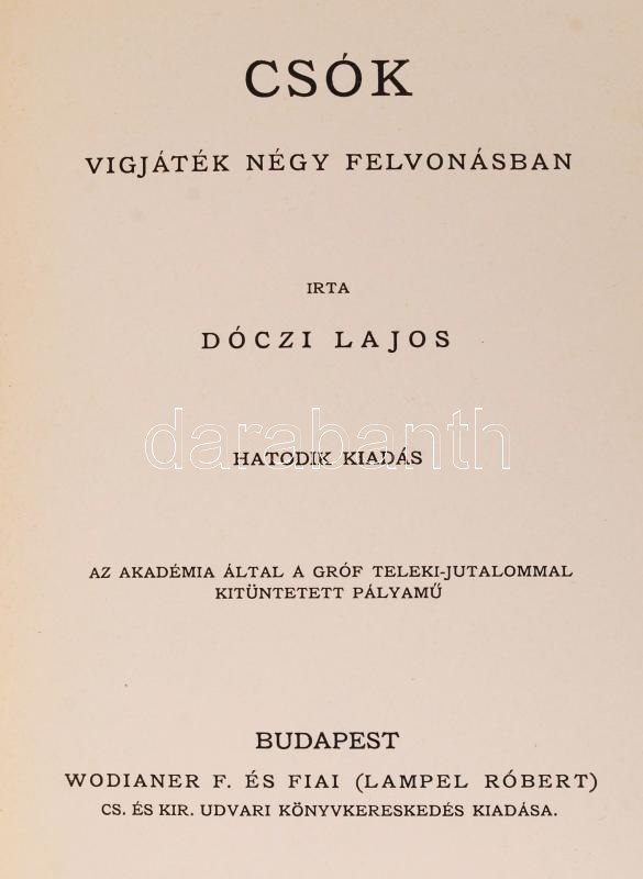 Dóczi Lajos: Csók. Kiadói aranyozott gerincű, festett egészvászon kötés, aranyozott lapszélek, kopottas állapotban. Aranyozott kiadói egészbőr-kötésben, aranyozott lapszélekkel Budapest, Lampel Róbert (Wodianer F. és fiai)