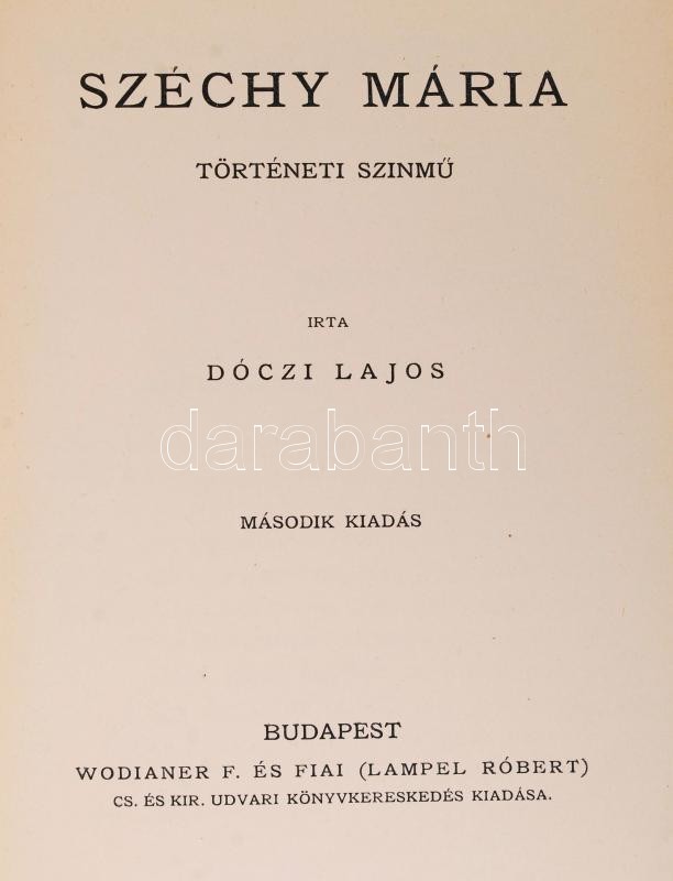 Leírás: Dóczi Lajos: Széchy Mária. Aranyozott kiadói egészbőr-kötésben, aranyozott lapszélekkel Budapest, Lampel Róbert (Wodianer F. és fiai)