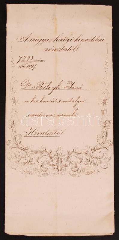 1897., Dr Balogh Jenő ezredorvosi kinevezése, báró Fejérváry Géza honvédelmi miniszter, későbbi miniszterelnök saját kezű aláírásával, száraz pecséttel ellátva