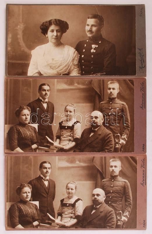 1911-1913 3db nagyobb méretű keményhátú kabinetfotó, Katona családjával " Pápa- Sörensen Béla" , hátoldalán feliratozva, 20,5 x 11 cm/ Military photo, soldier with his family before the world war I., label on the back