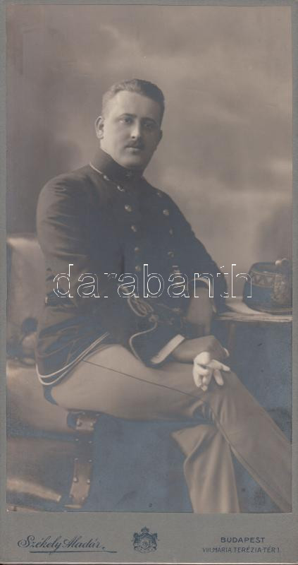1913 Székely Aladár műtermében készült, ülő alakos katona portré, a kép hátoldalán nagyon szép szecessziós műtermi reklámgrafika Aiglon jelzettel, keményhátú, 21x11 cm