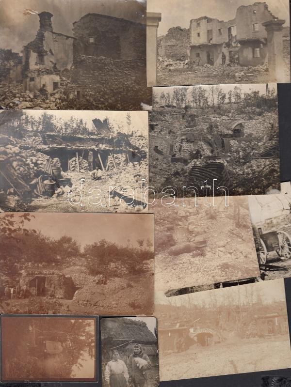 1914-1918 Katonai fotótétel az I. vh-ból, egy, a harctéren szolgálatot teljesítő katona albumából, fotók egy része feliratozva, 19 db fénykép, a 8x11 cm és 4x8 cm közötti méretekben