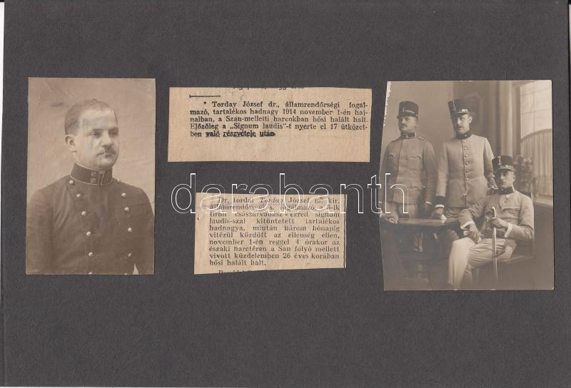 1914 Katonai fotó, az I. vh-ban hősi halált halt Torday József dr. két fényképe és két rövid hír a haláláról albumlapra felragasztva, kartonméret 16x24 cm