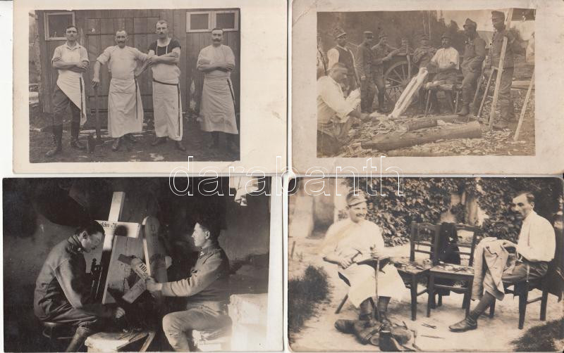 Leírás: cca 1914-1918 Mesteremberek katonai szolgálatban, mészárosok, bognárok, ácsok, szabók, cipészek, 4 db fotólap, kettő feliratozva, 9x14 cm