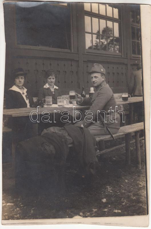 Leírás: cca 1914 Katonai fotó, fiatal baka kimenőjén sörözget, 19x13 cm