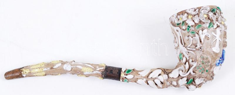 Leírás: Antik tajtékpipa, gazdagon faragott, kézzel festett, jó állapotban,fém vég hiányzik, h:19,5 cm