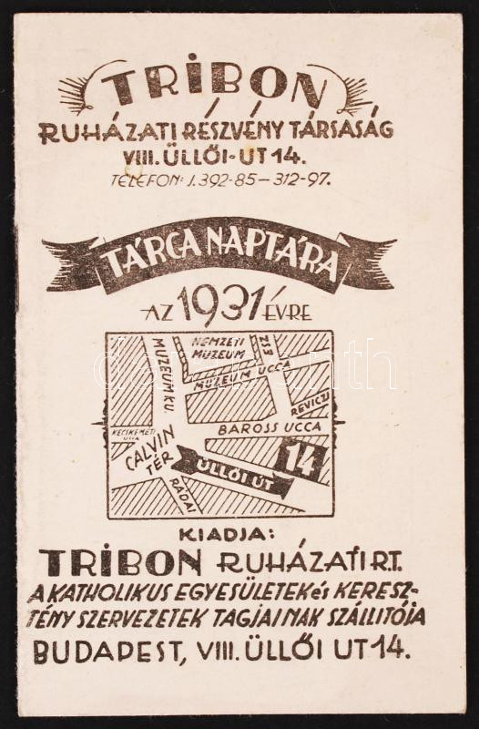 1931 Bp., A Tribon Ruházati Részvénytársaság tárcanaptára az 1931. évr... https://www.darabanth.com/hu/214-Gyorsarveres/214.0/Festmeny-mutargy-papirregiseg-egyeb/Nyomtatvanyok~29/1931-Bp-A-Tribon-Ruhazati-Reszvenytarsasag-tarcanaptara-az-1931-evre~II886744