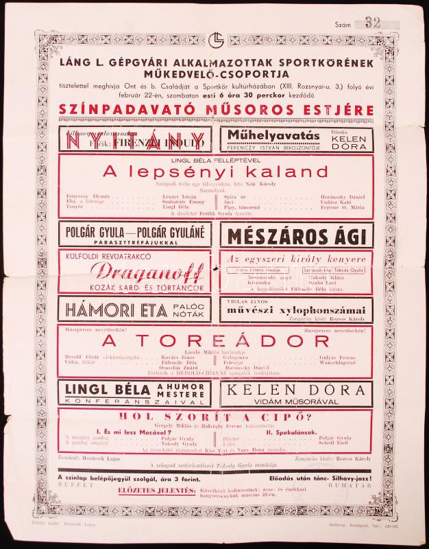 Leírás: cca 1930-1940 Láng L. Gépgyár Alkalmazottak Sportkörének Műkedvelő-csoportja által rendezett színpadavató műsoros estjének plakátja