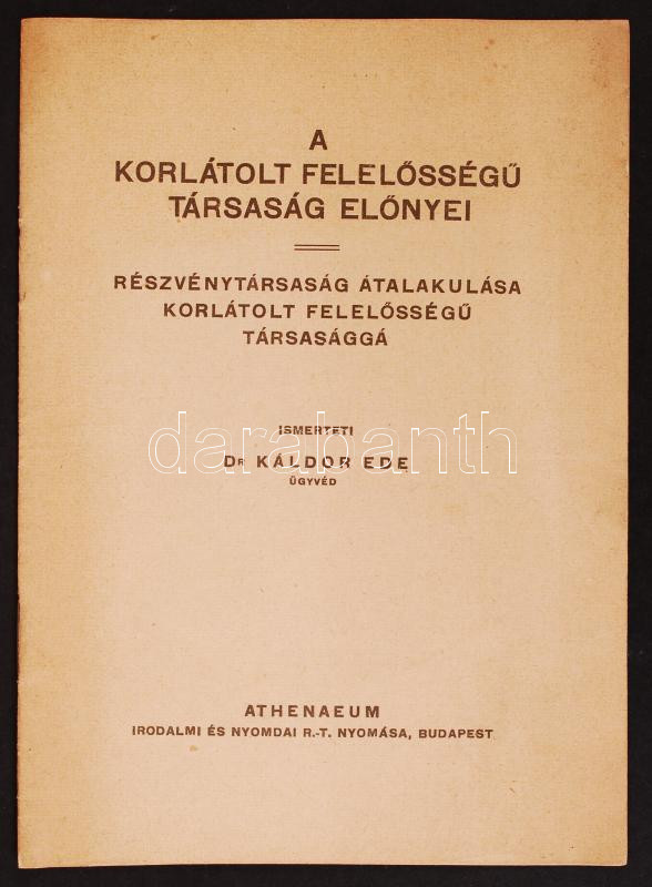 cca 1930 A Korlátolt Felelősségű Társaság előnyei. Ismerteti Dr. Káldo... https://www.darabanth.com/hu/214-Gyorsarveres/214.0/Festmeny-mutargy-papirregiseg-egyeb/Nyomtatvanyok~29/cca-1930-A-Korlatolt-Felelossegu-Tarsasag-elonyei-Ismerteti-Dr-Kaldor-Ede-ugyved-18p~II899246