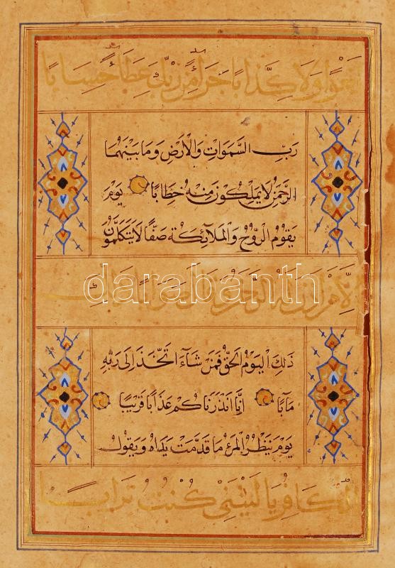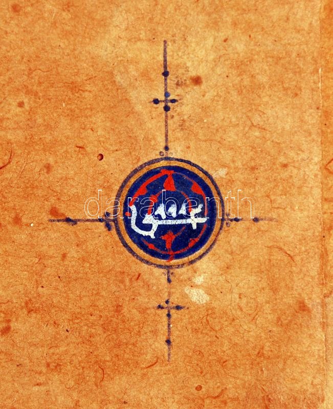 cca 1880-1900 Kézzel írott perzsa szent díszítőmotívumokkal aranyozott egészbőr kötésben, sérült állapotban, 8p /