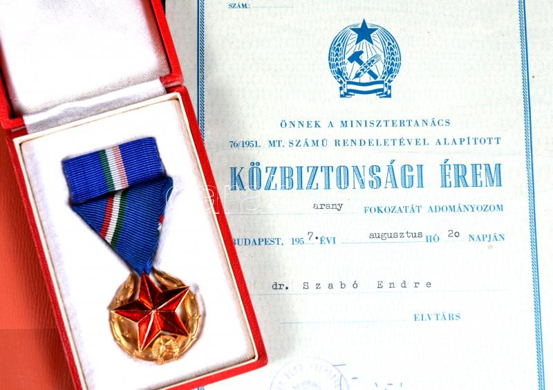 Leírás: 1957. "Közbiztonsági Érem" arany fokozata a rendőrség tagjai részére mellszalaggal, szalagsávval eredeti tokban + adományozói okirat T:2