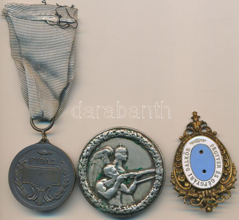 Leírás: ~1900. "Fegyver és Gépgyári Dalkör" zománcozott Br díszes jelvény hiányzó rátéttel, készítő: "AD. Belada, Mariahilferst. 54 Wien" + Sződy Szilárd (1878-1939) ~1935. Levente lövész jelvény (48mm) + Franciaország 1918-1919. "FIDAC (Veteránok Nemzetközi Szövetsége)" Br emlékérem mellszalaggal (36,5mm) T:2
