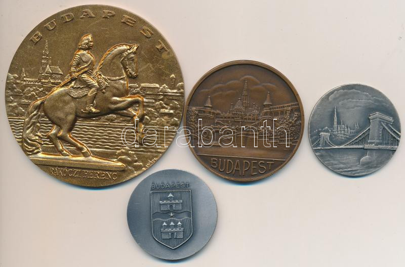 Leírás: Iván István (1905-1968) DN "Budapest - Rákóczi Ferenc" aranyozott Br emlékérem (80mm) + 1976. "Budapest" Br emlékérem (53,5mm) + DN "Budapest" ezüstözött Br emlékérem (40mm) + DN "Lánchíd" ezüstözött Br emlékérem (40mm) T:1-,2