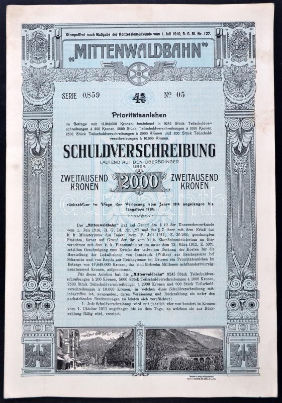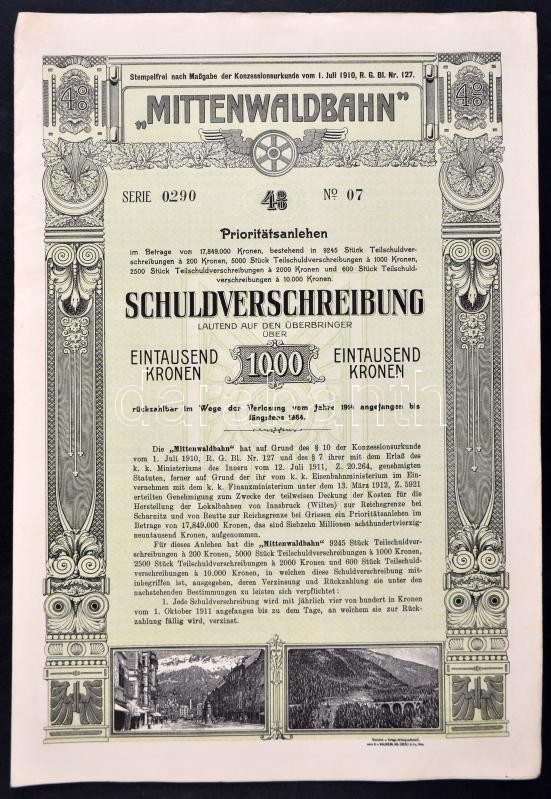 Ausztria / Innsbruck 1912. "Mittenwaldbahn" vasúti kötvény 1000K-ról é...