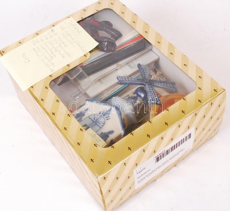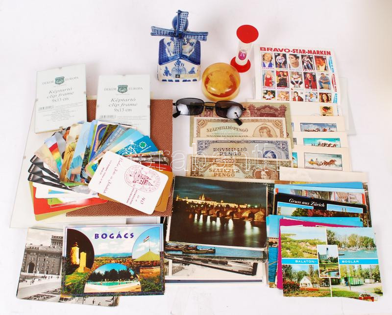 Leírás: Doboznyi bolha tétel, benne zenélő malom, ásvány, képkeret, homokóra, képeslap, stb.)