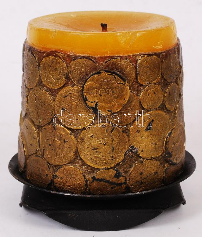 Leírás: Pénzérmék mintájával díszített gyertya tartóval, d: 10 cm, m: 10 cm