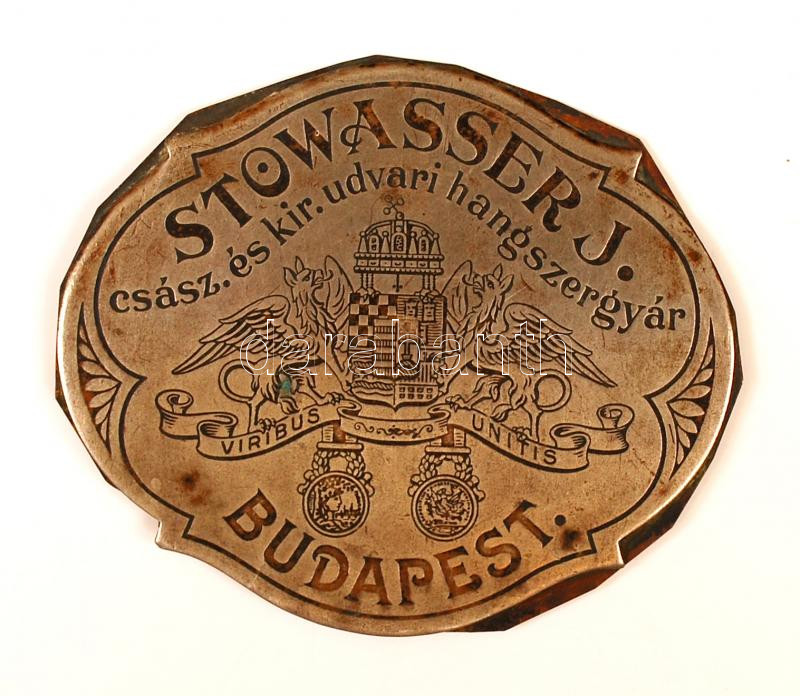 Leírás: Stowasser J. csász. és kir. udvari hangszergyár Budapest gyártmányú dob fém táblája, 9x8 cm
