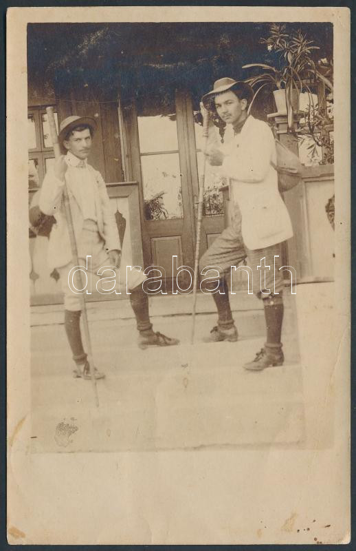 Leírás: 1910. február 9. Kolozsvárról Tekére (Erdély) küldött privát fotólap Jupiter Erzsikének, diákok turista bottal, 14x9 cm