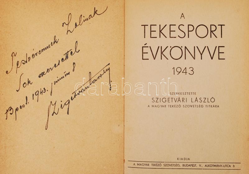 Leírás: Szigetvári László(szerk.): A tekesport évkönyve 1943. Dedikált! Bp., 1943, Magyar Tekéző Szövetség. Kiadói aranyozott félvászon kötés, kopottas állapotban.