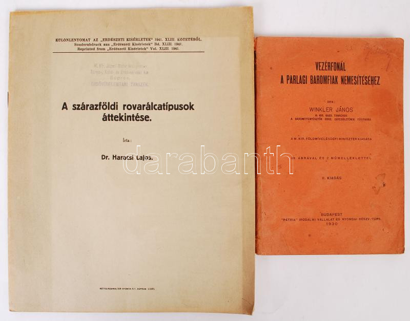 Leírás: 2 kiadvány-Winkler János: Vezérfonal a parlagi baromfiak nemesítéséhez. Bp., 1930, Pátria; Dr. Haracsi Lajos: A szárazföldi rovarálcatípusok áttekintése. Sopron, Röttig-Romwalter. Kiadói papírkötés, kopottas állapotban.
