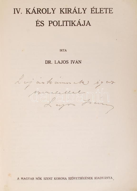 Dr. Lajos Iván: IV. Károly élete és politikája. Dedikált! Magyar Nők Szent Korona Szövetségének kiadványa. Kiadói egészvászon kötés, belső előlapja foltos, sérült, kopottas állapotban.