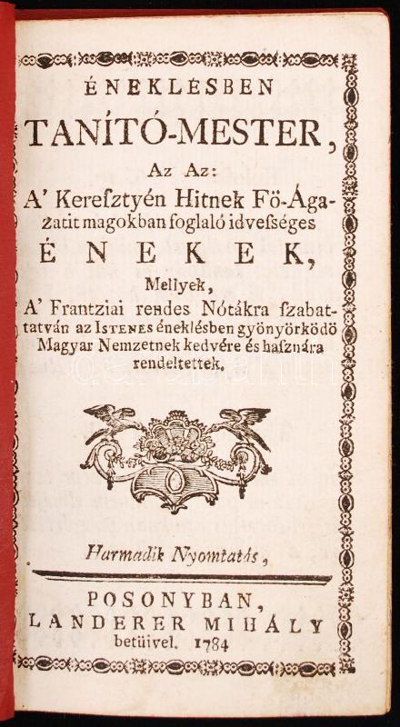 Éneklésben tanító-mester, az-az A'Kersztyén hitnek fő ágazatait magokban foglaló idvességes énekek melyek, A'Frantziai rendes nótákra szabatván az Istenes éneklésben gyönyörködő Magyar Nemzetnek kedvére és hasznára rendeltettek. Harmadik nyomtatás. Posonyban Landerer Mihály betűivel. 1784. Modern kartonkötésben