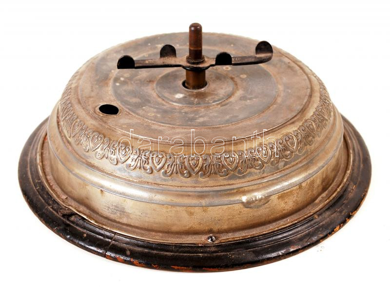 Leírás: Antik D.R.G.M. márkájú zenedoboz, karácsonyi dallamokkal, sérült, működik, fém ház fa talapzat, m:10 cm, d:28 cm