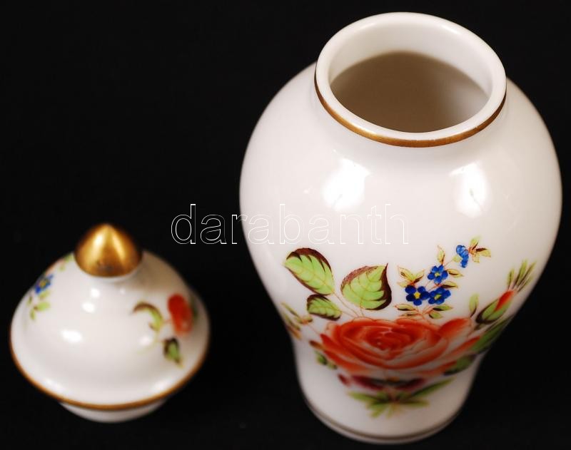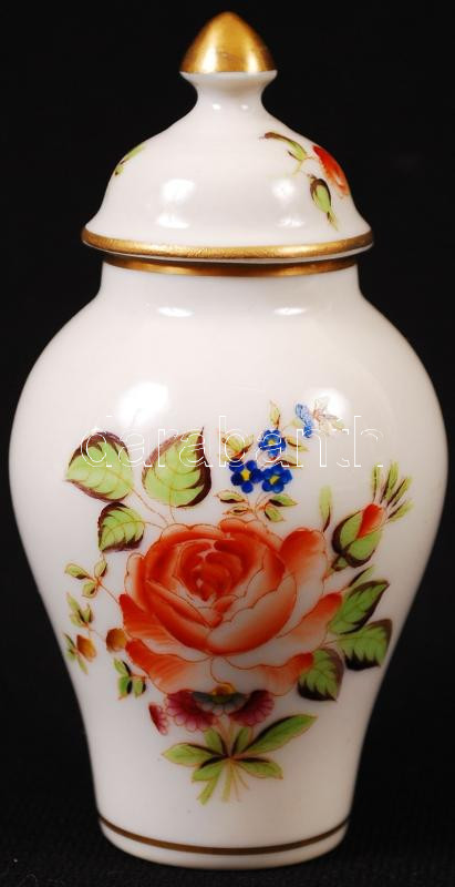 Leírás: Herendi virágmintás kézzel festett porcelán mini váza fedéllel, hibátlan, jelzett, m: 10 cm