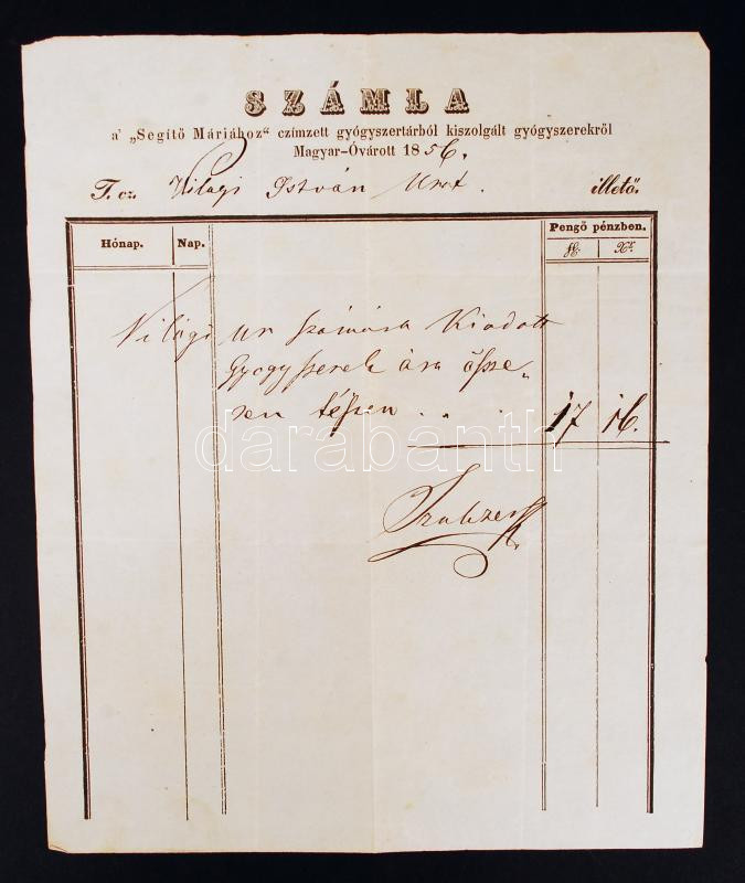 1856 Mosonmagyaróvár, Segítő Máriához címzett gyógyszertár által kiáll... https://www.darabanth.com/hu/215-Gyorsarveres/215.0/Festmeny-mutargy-papirregiseg-egyeb/Reklam~39/1856-Mosonmagyarovar-Segito-Mariahoz-cimzett-gyogyszertar-altal-kiallitott-szamla~II895430