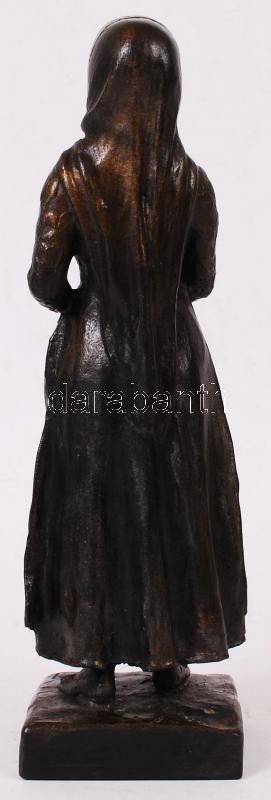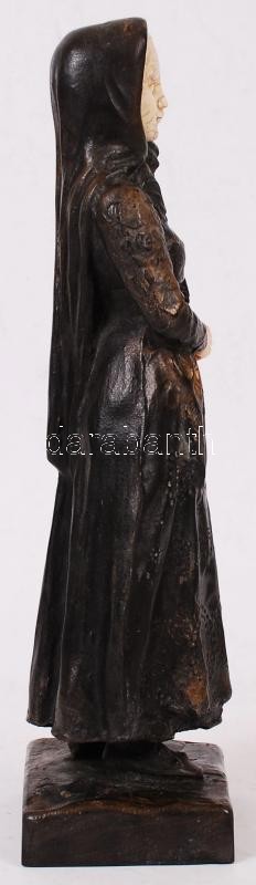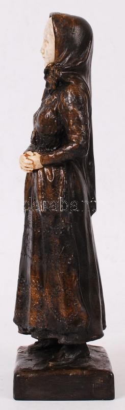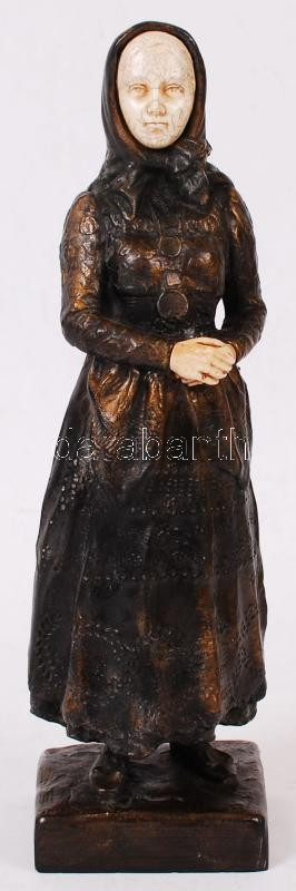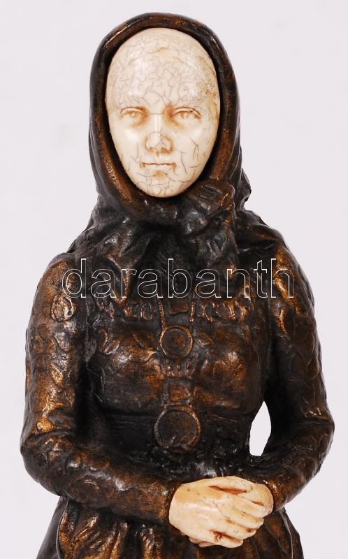 Leírás: Fejkendős lány, festett műgyanta?, csont szerű berakásokkal, jelzés nélkül, jó állapotban, m:24 cm