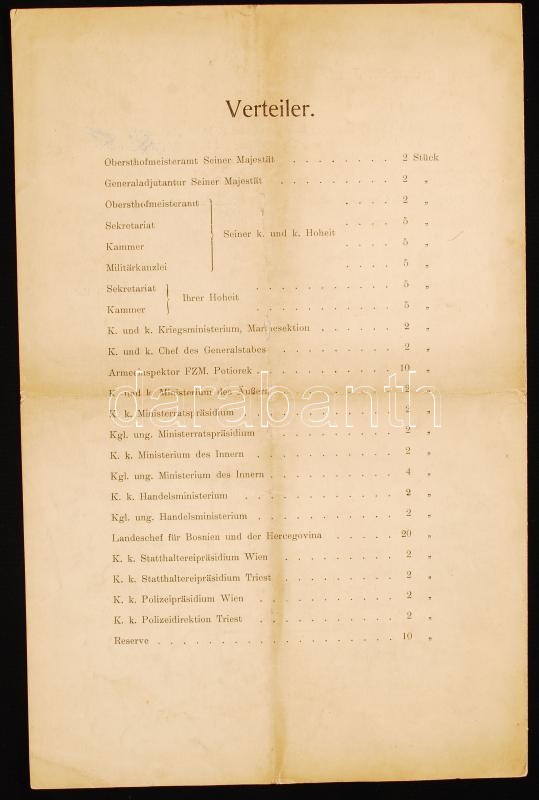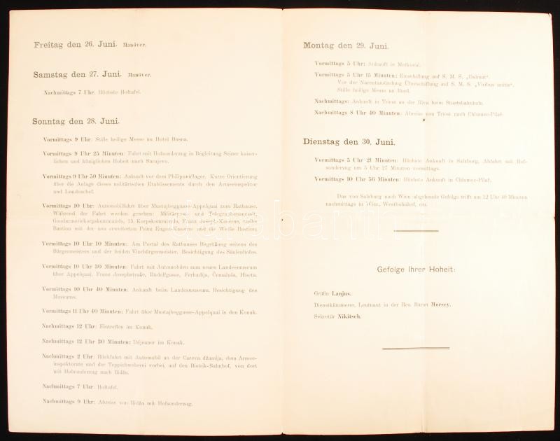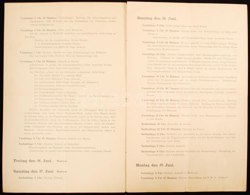 1914 Ferenc Ferdinánd trónörökös és Zsófia főhercegnő végzetes boszniai látogatásának korabeli, részletes programfüzetei. A programokat a szarajevói merénylet szakította meg. Érdekes kortörténeti dokumentum. / 1914 Detailed program booklet of Franz Ferdinand and Sivie von Hohenberg in Bosnia. The program was interrupted by an assassination that boke out World war I. 8p.+6p.