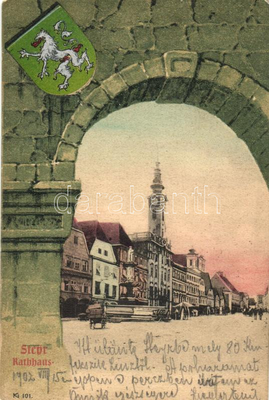 Steyr, Rathaus / town hall, gate, coat of arms litho (EK) https://www.darabanth.com/hu/215-Gyorsarveres/215.0/Kepeslapok/Ausztria~40021/Steyr-Rathaus-town-hall-gate-coat-of-arms-litho-EK~II908072